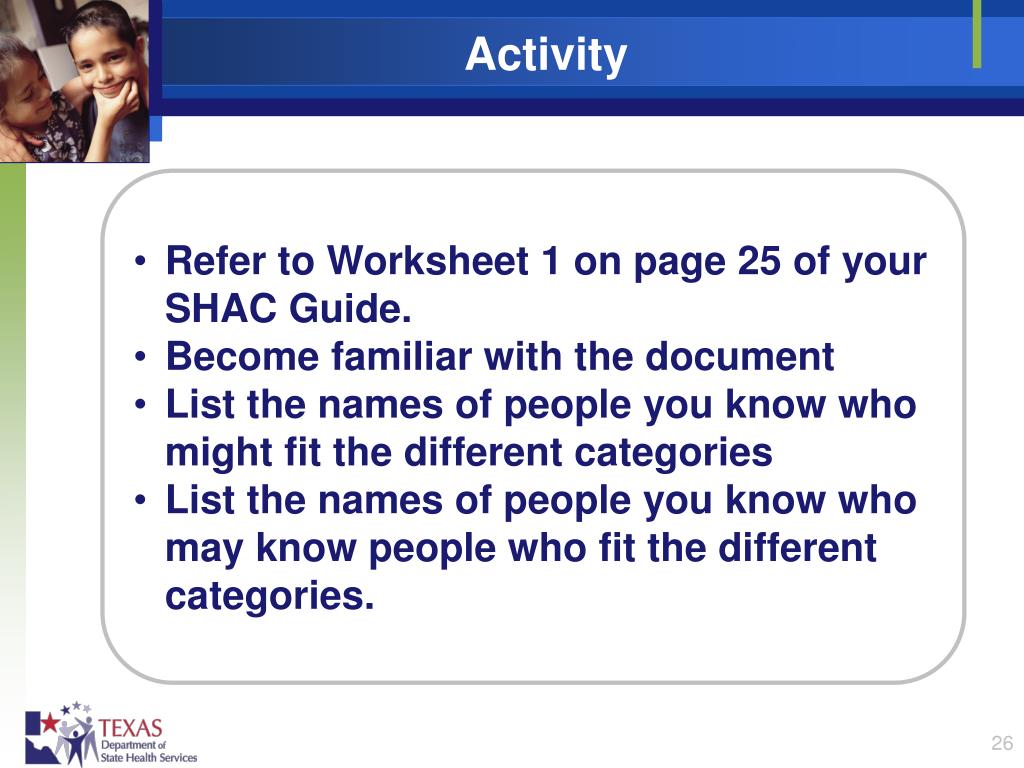 Activity • Refer to Worksheet 1 on page 25 of your SHAC Guide. • Become familiar with the document • List the names of people you know who might fit the different categories • List the names of people you know who may know people who fit the different categories.
