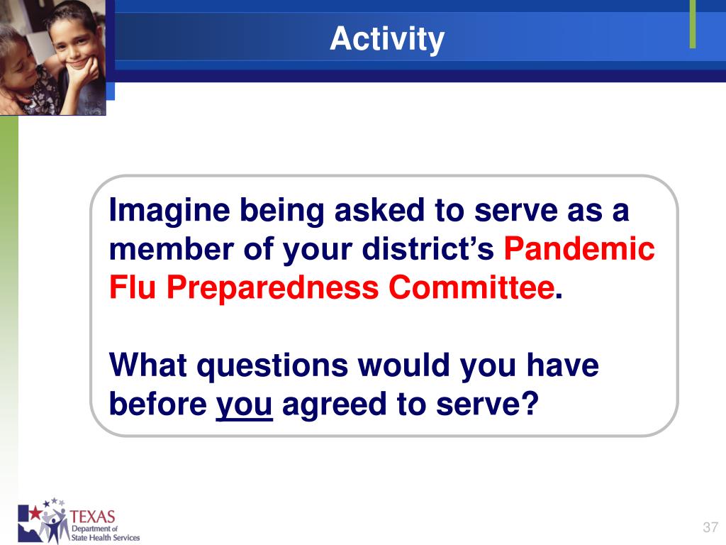 Activity Imagine being asked to serve as a member of your district’s Pandemic Flu Preparedness Committee. What questions would you have before you agreed to serve?