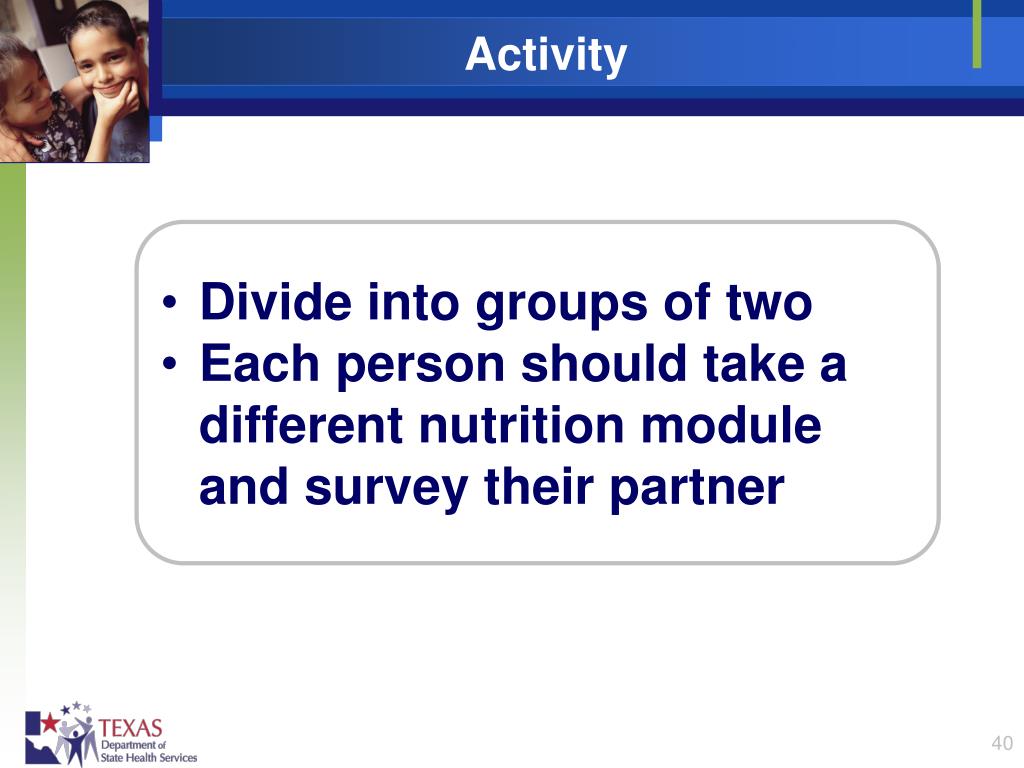 Activity • Divide into groups of two • Each person should take a different nutrition module and survey their partner