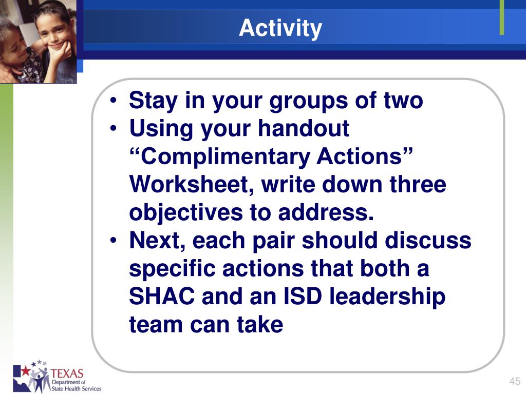 Activity • Stay in your groups of two • Using your handout “Complimentary Actions” Worksheet, write down three objectives to address. • Next, each pair should discuss specific actions that both a SHAC and an ISD leadership team can take