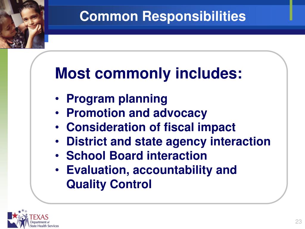 Common Responsibilities • Most commonly includes: • Program planning • Promotion and advocacy • Consideration of fiscal impact • District and state agency interaction • School Board interaction • Evaluation, accountability and Quality Control