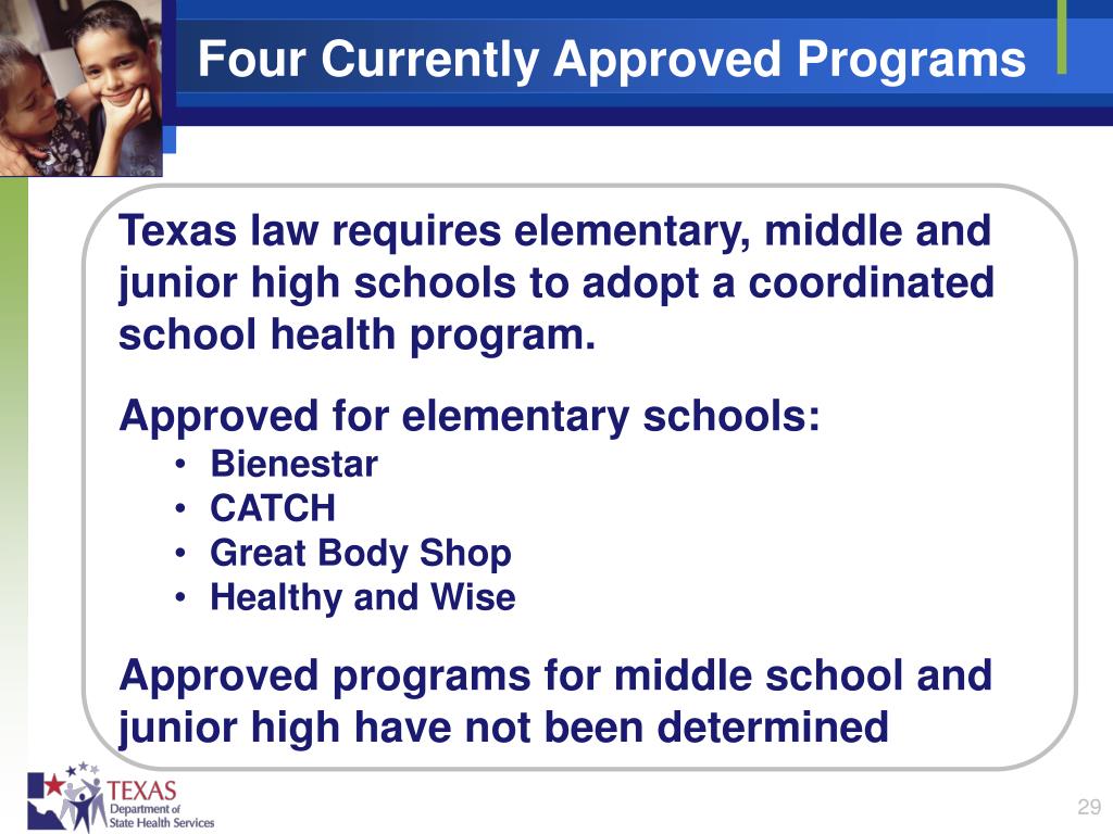 Four Currently Approved Programs • Texas law requires elementary, middle and junior high schools to adopt a coordinated school health program. • Approved for elementary schools: • Bienestar • CATCH • Great Body Shop • Healthy and Wise • Approved programs for middle school and junior high have not been determined