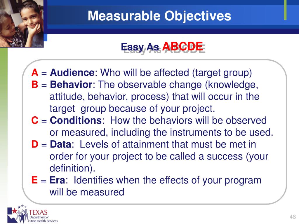Measurable Objectives Easy As ABCDE A = Audience: Who will be affected (target group) B = Behavior: The observable change (knowledge, attitude, behavior, process) that will occur in the target group because of your project. C = Conditions: How the behaviors will be observed or measured, including the instruments to be used. D = Data: Levels of attainment that must be met in order for your project to be called a success (your definition). E = Era: Identifies when the effects of your program will be measured