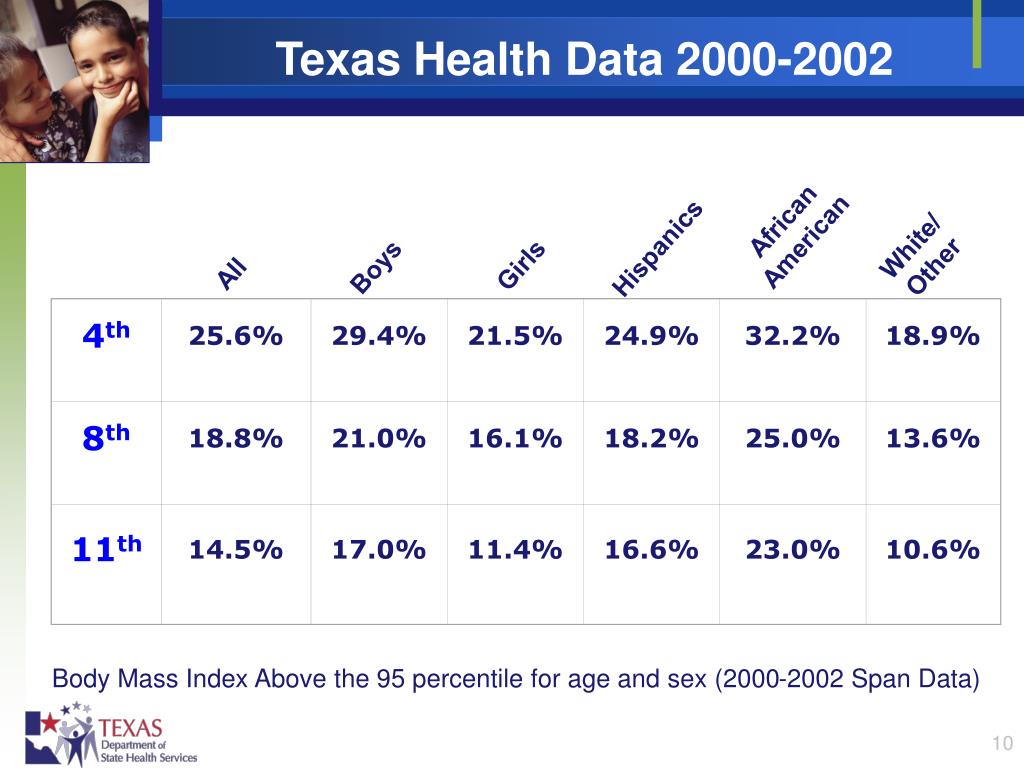 4th 25.6% 29.4% 21.5% 24.9% 32.2% 18.9% 8th 18.8% 21.0% 16.1% 18.2% 25.0% 13.6% 11th 14.5% 17.0% 11.4% 16.6% 23.0% 10.6% Texas Health Data 2000-2002 African American Hispanics White/ Other Girls All Boys Body Mass Index Above the 95 percentile for age and sex (2000-2002 Span Data)