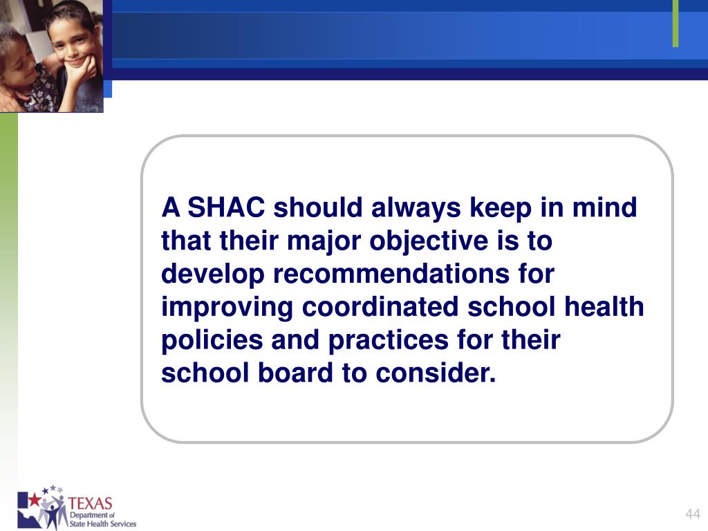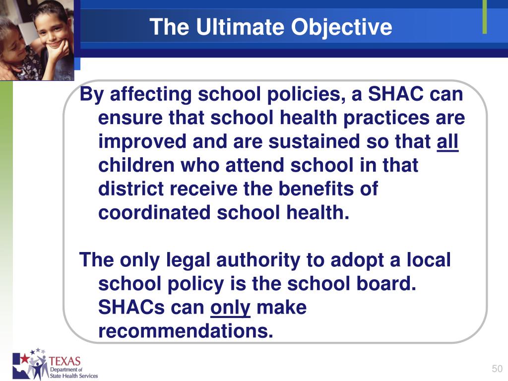 The Ultimate Objective By affecting school policies, a SHAC can ensure that school health practices are improved and are sustained so that all children who attend school in that district receive the benefits of coordinated school health. The only legal authority to adopt a local school policy is the school board. SHACs can only make recommendations.