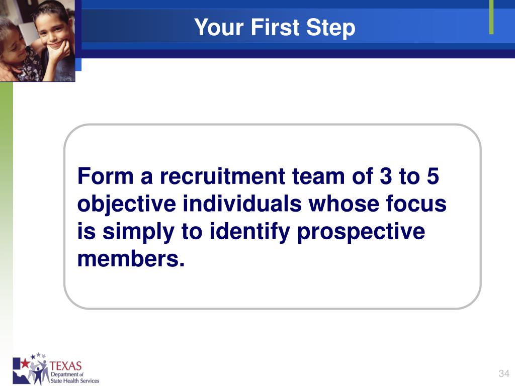 Your First Step Form a recruitment team of 3 to 5 objective individuals whose focus is simply to identify prospective members.