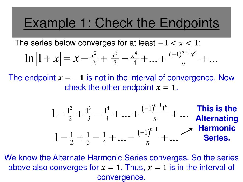 Example 1: Check the Endpoints The series below converges for at least : The endpoint is not in the interval of convergence. Now check the other endpoint . This is the Alternating Harmonic Series. We know the Alternate Harmonic Series converges. So the series above also converges for . Thus, is in the interval of convergence.