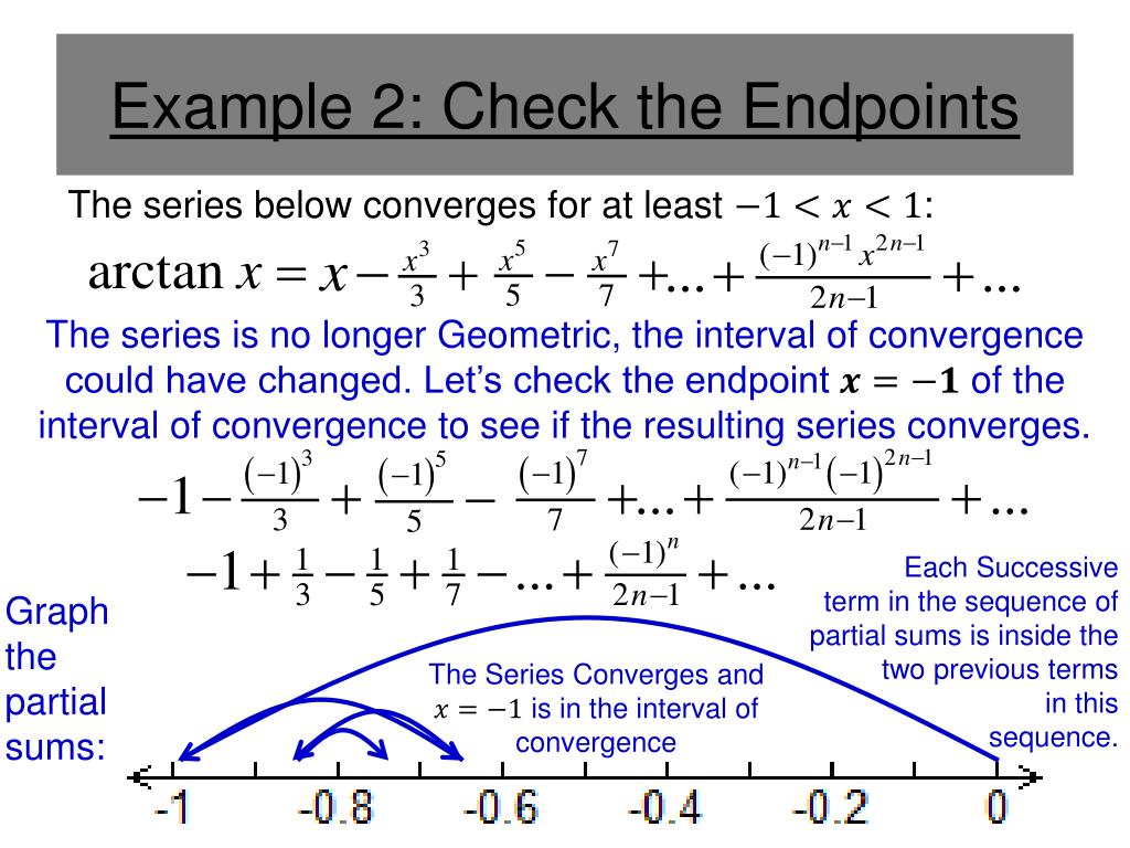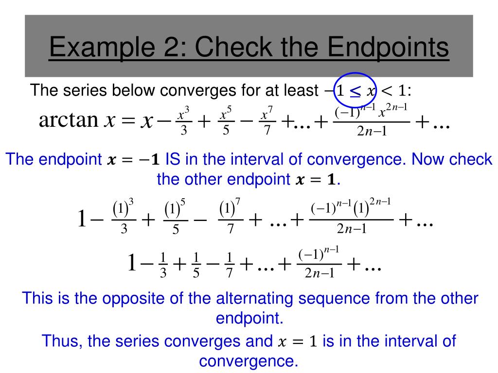 Example 2: Check the Endpoints The series below converges for at least : The endpoint IS in the interval of convergence. Now check the other endpoint . This is the opposite of the alternating sequence from the other endpoint. Thus, the series converges and is in the interval of convergence.