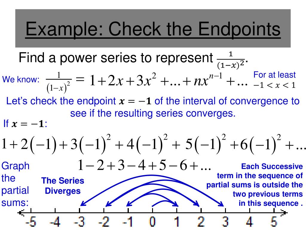 Example: Check the Endpoints Find a power series to represent . For at least We know: The endpoint is not in the interval of convergence. Now check the other endpoint . If : Notice: By the nth Term Test, the Series Diverges.