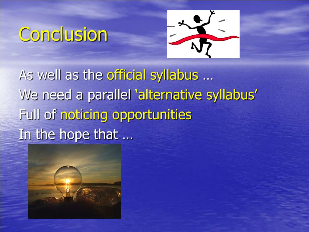 Conclusion As well as the official syllabus … We need a parallel ‘alternative syllabus’ Full of noticing opportunities In the hope that …