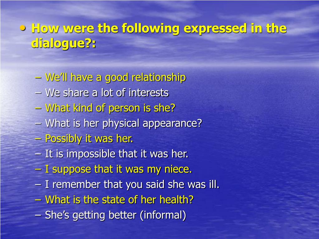 How were the following expressed in the dialogue?: • We’ll have a good relationship • We share a lot of interests • What kind of person is she? • What is her physical appearance? • Possibly it was her. • It is impossible that it was her. • I suppose that it was my niece. • I remember that you said she was ill. • What is the state of her health? • She’s getting better (informal)