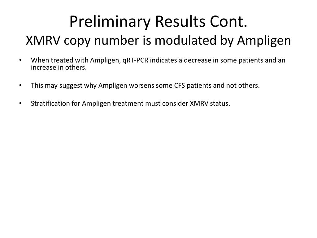Preliminary Results Cont.XMRV copy number is modulated by Ampligen • When treated with Ampligen, qRT-PCR indicates a decrease in some patients and an increase in others. • This may suggest why Ampligen worsens some CFS patients and not others. • Stratification for Ampligen treatment must consider XMRV status.
