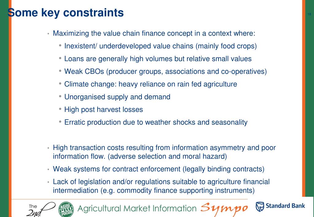 Some key constraints • Maximizing the value chain finance concept in a context where: • Inexistent/ underdeveloped value chains (mainly food crops) • Loans are generally high volumes but relative small values • Weak CBOs (producer groups, associations and co-operatives) • Climate change: heavy reliance on rain fed agriculture • Unorganised supply and demand • High post harvest losses • Erratic production due to weather shocks and seasonality • High transaction costs resulting from information asymmetry and poor information flow. (adverse selection and moral hazard) • Weak systems for contract enforcement (legally binding contracts) • Lack of legislation and/or regulations suitable to agriculture financial intermediation (e.g. commodity finance supporting instruments)