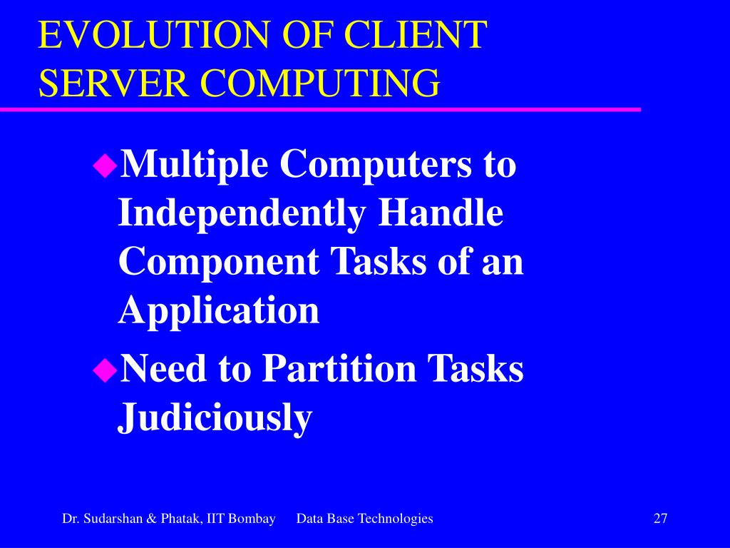 EVOLUTION OF CLIENT SERVER COMPUTING • Multiple Computers to Independently Handle Component Tasks of an Application • Need to Partition Tasks Judiciously Data Base Technologies