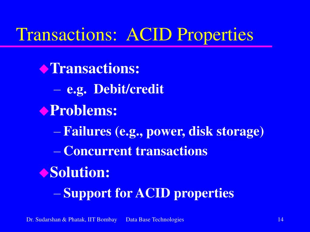 Transactions: ACID Properties • Transactions: • e.g. Debit/credit • Problems: • Failures (e.g., power, disk storage) • Concurrent transactions • Solution: • Support for ACID properties Data Base Technologies