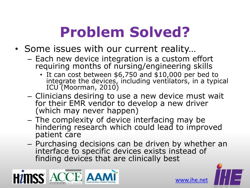Problem Solved? • Some issues with our current reality… • Each new device integration is a custom effort requiring months of nursing/engineering skills • It can cost between $6,750 and $10,000 per bed to integrate the devices, including ventilators, in a typical ICU (Moorman, 2010) • Clinicians desiring to use a new device must wait for their EMR vendor to develop a new driver (which may never happen) • The complexity of device interfacing may be hindering research which could lead to improved patient care • Purchasing decisions can be driven by whether an interface to specific devices exists instead of finding devices that are clinically best