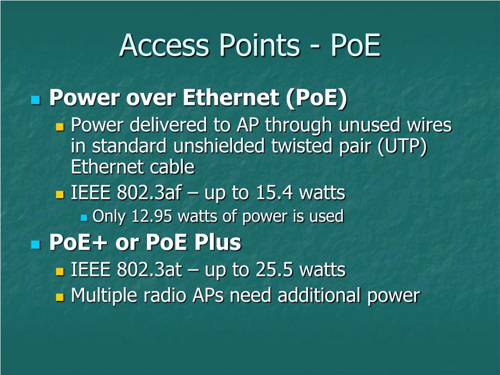 Access Points - PoE • Power over Ethernet (PoE) • Power delivered to AP through unused wires in standard unshielded twisted pair (UTP) Ethernet cable • IEEE 802.3af – up to 15.4 watts • Only 12.95 watts of power is used • PoE+ or PoE Plus • IEEE 802.3at – up to 25.5 watts • Multiple radio APs need additional power