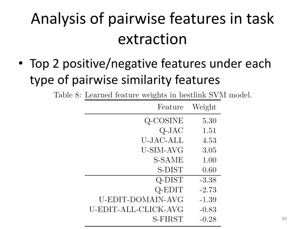 Analysis of pairwise features in task extraction • Top 2 positive/negative features under each type of pairwise similarity features