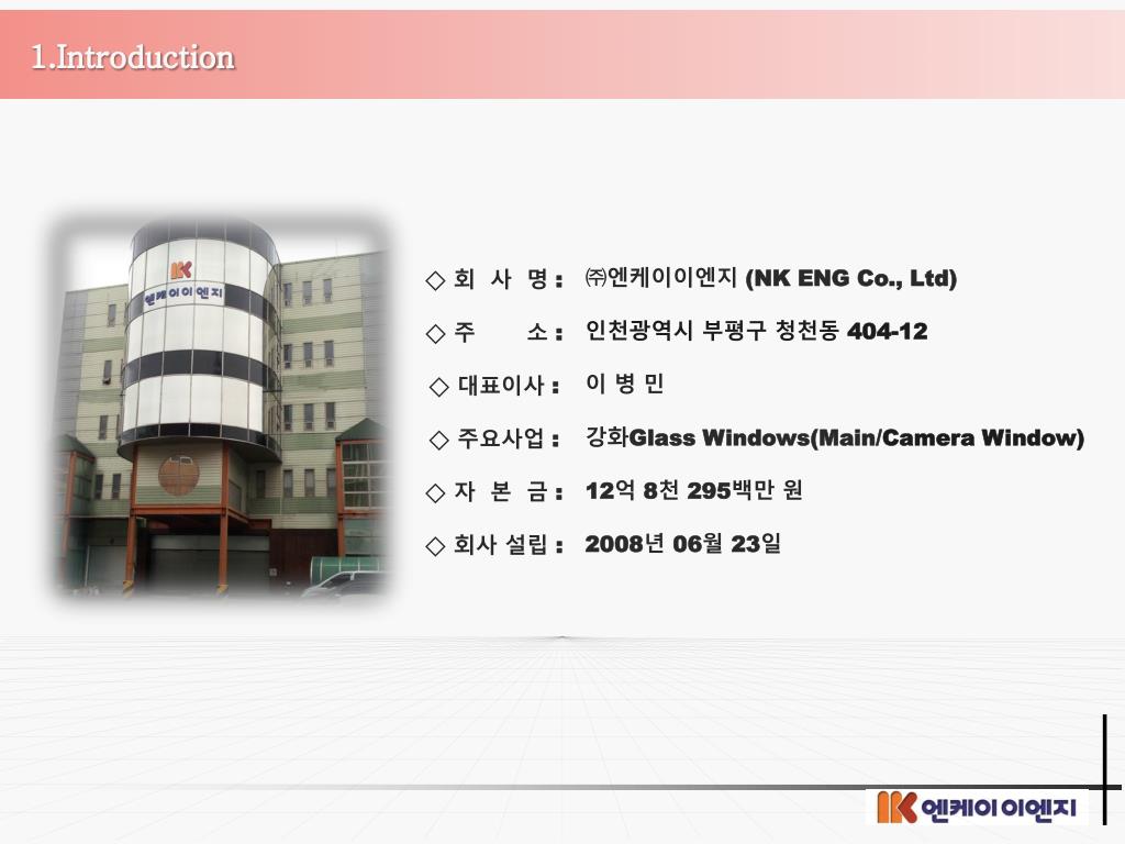 Company Profile. NKEng Co.,Ltd 2013. Rev.00. 1.Introduction. 2 . NK Eng History. 2008 년 06 월 법인 설립 : 인천광역시 계양구 계산 2 동 922-4 07 월 PANTECH 계열 협력 업체 등록 ▶ 일본 KDDI 모델 : ELDER3 강화 GLASS WINDOW 개발완료 및 양산 개시 08 월 자본금 증자 (1 억 3 억 )