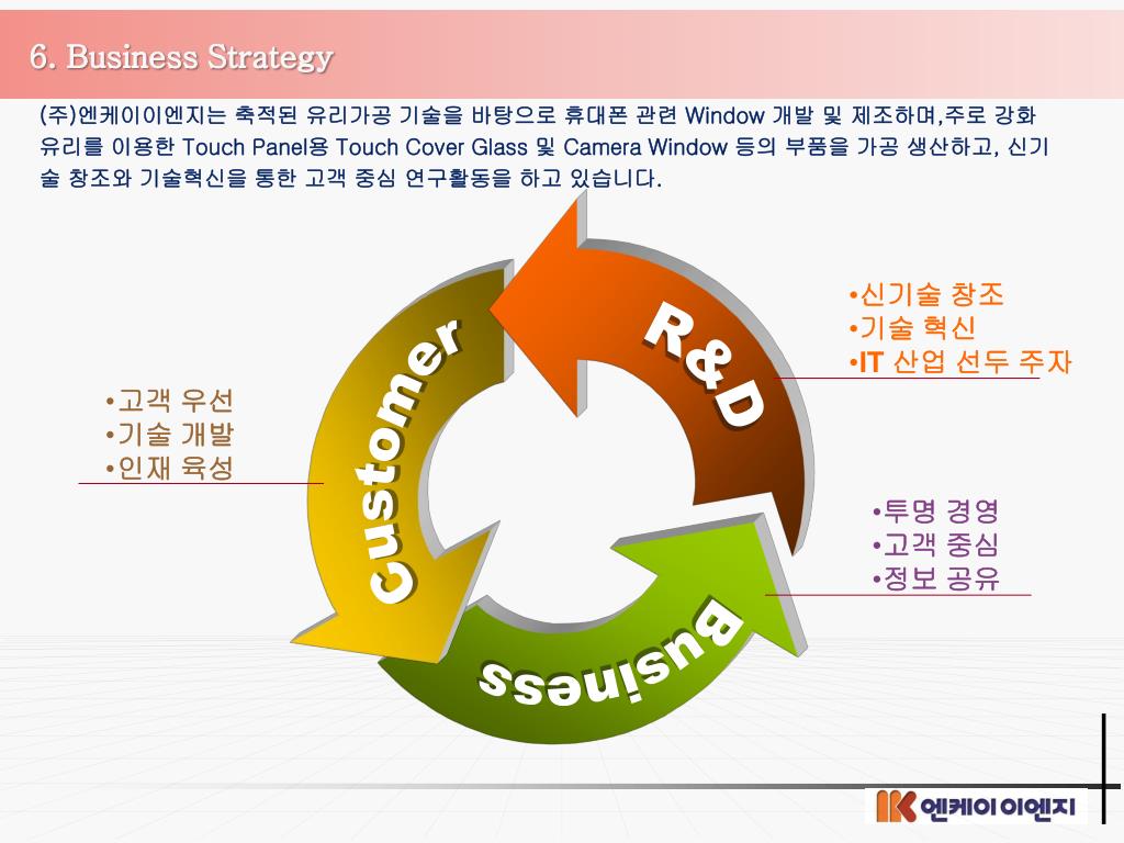 6. Business Strategy (주)엔케이이엔지는 축적된 유리가공 기술을 바탕으로 휴대폰 관련 Window 개발 및 제조하며,주로 강화유리를이용한Touch Panel용 Touch Cover Glass 및 Camera Window 등의부품을 가공 생산하고, 신기술 창조와 기술혁신을 통한고객 중심 연구활동을 하고 있습니다. • 신기술 창조 • 기술 혁신 • IT 산업 선두 주자 R&D • 고객 우선 • 기술 개발 • 인재 육성 Customer • 투명 경영 • 고객 중심 • 정보 공유 Business