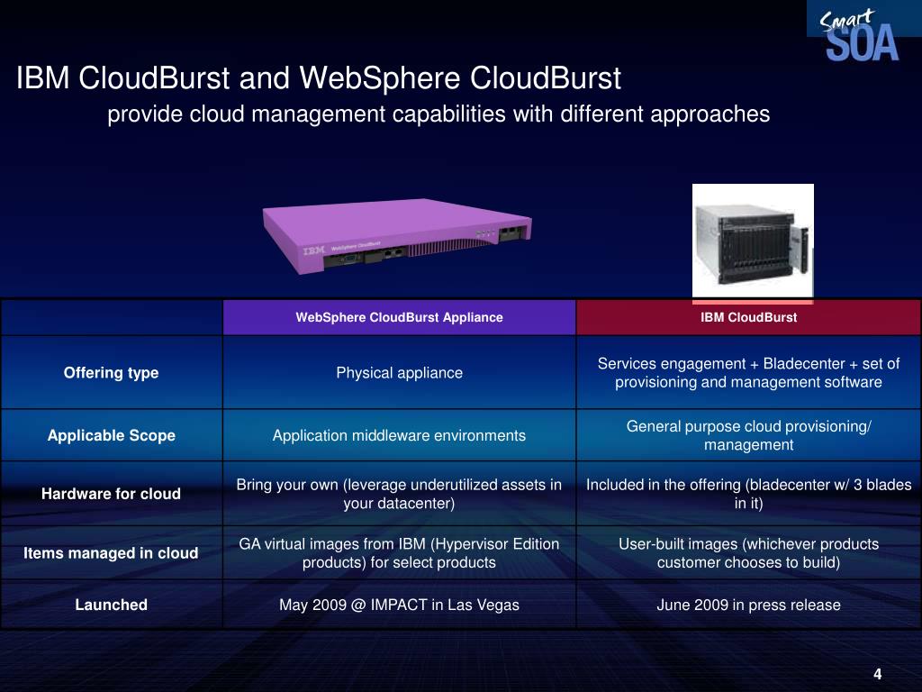 IBM CloudBurst and WebSphere CloudBurst provide cloud management capabilities with different approaches