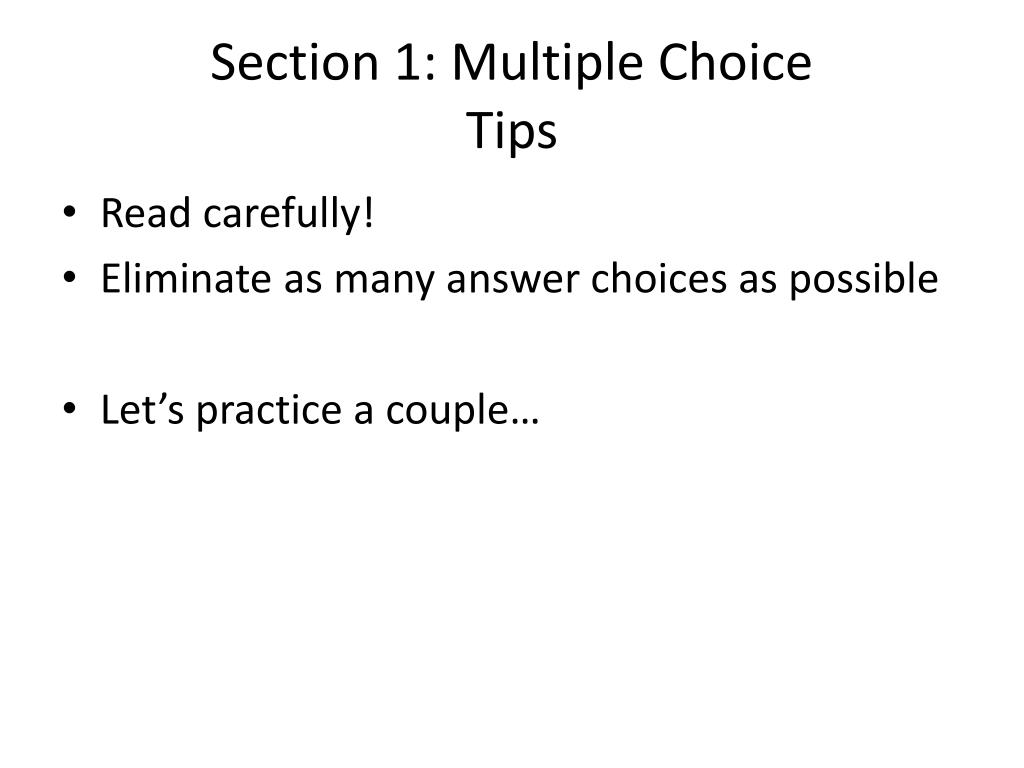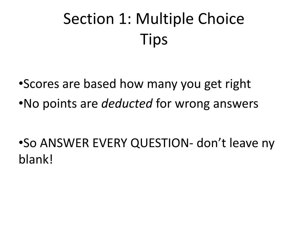 Section 1: Multiple ChoiceTips • Scores are based how many you get right • No points are deducted for wrong answers • So ANSWER EVERY QUESTION- don’t leave ny blank!