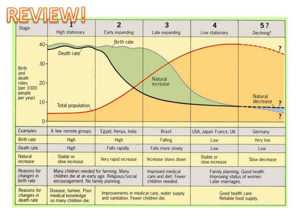 The Demographic Transition Fig. 2-13: The demographic transition consists of four stages, which move from high birth and death rates, to declines first in death rates then in birth rates, and finally to a stage of low birth and death rates. Population growth is most rapid in the second stage.
