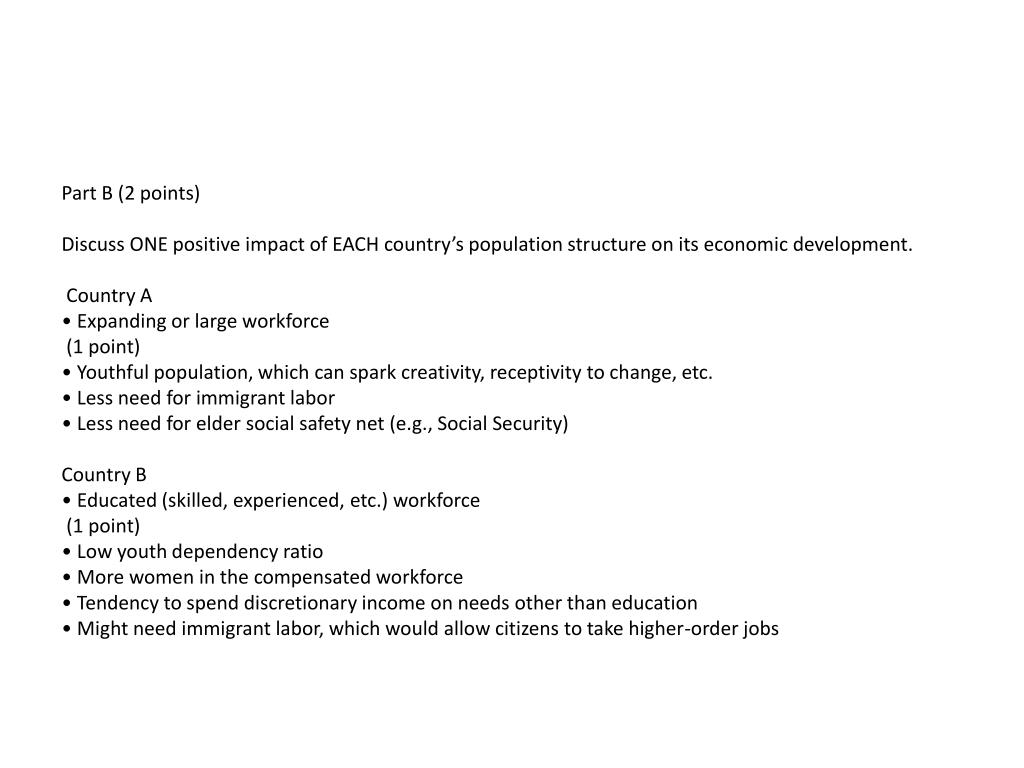 Part B (2 points) Discuss ONE positive impact of EACH country’s population structure on its economic development. Country A • Expanding or large workforce (1 point) • Youthful population, which can spark creativity, receptivity to change, etc. • Less need for immigrant labor • Less need for elder social safety net (e.g., Social Security) Country B • Educated (skilled, experienced, etc.) workforce (1 point) • Low youth dependency ratio • More women in the compensated workforce • Tendency to spend discretionary income on needs other than education • Might need immigrant labor, which would allow citizens to take higher-order jobs