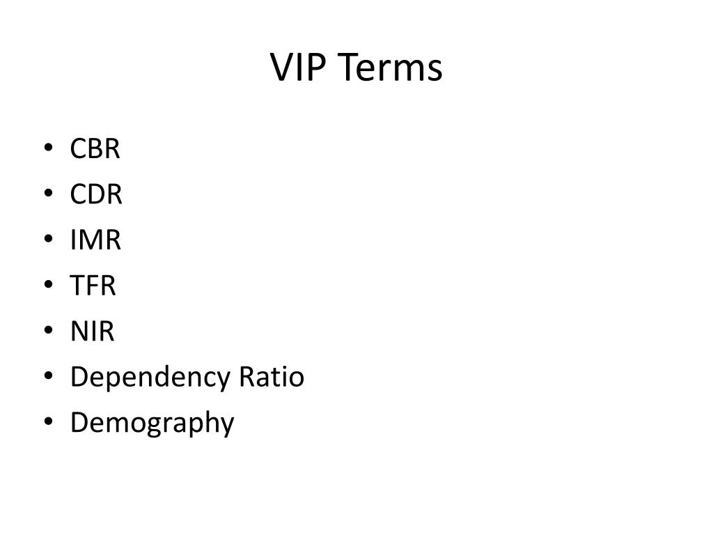 VIP Terms • CBR • CDR • IMR • TFR • NIR • Dependency Ratio • Demography