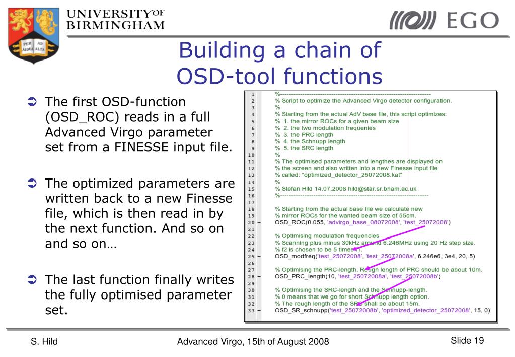 Building a chain of OSD-tool functions • The first OSD-function (OSD_ROC) reads in a full Advanced Virgo parameter set from a FINESSE input file. • The optimized parameters are written back to a new Finesse file, which is then read in by the next function. And so on and so on… • The last function finally writes the fully optimised parameter set. Advanced Virgo, 15th of August 2008