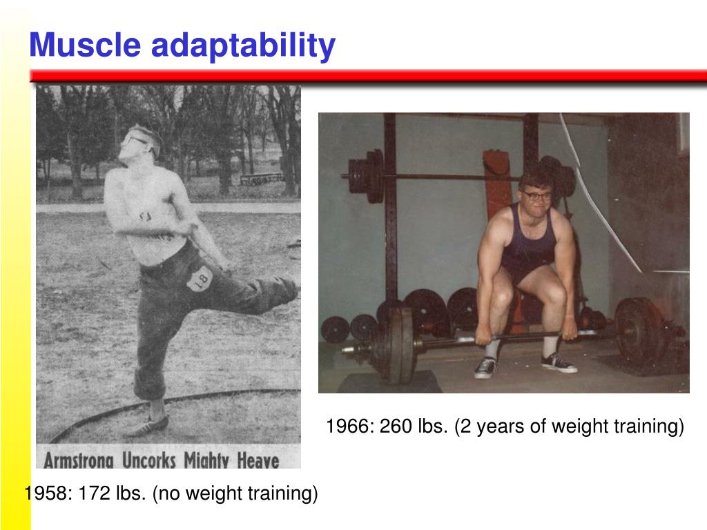 Muscle adaptability 1966: 260 lbs. (2 years of weight training) 1958: 172 lbs. (no weight training)