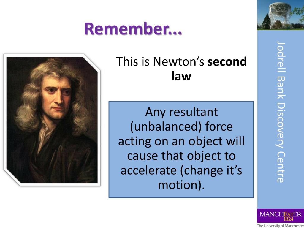Remember... This is Newton’s second law Any resultant (unbalanced) force acting on an object will cause that object to accelerate (change it’s motion). Jodrell Bank Discovery Centre