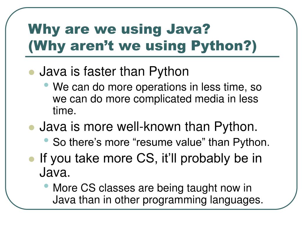 Why are we using Java?(Why aren’t we using Python?) • Java is faster than Python • We can do more operations in less time, so we can do more complicated media in less time. • Java is more well-known than Python. • So there’s more “resume value” than Python. • If you take more CS, it’ll probably be in Java. • More CS classes are being taught now in Java than in other programming languages.