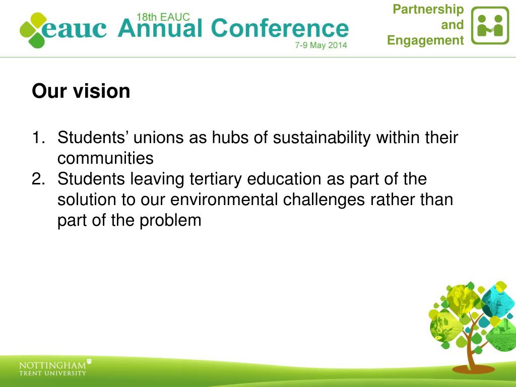 Partnership and Engagement Our vision Students’ unions as hubs of sustainability within their communities Students leaving tertiary education as part of the solution to our environmental challenges rather than part of the problem