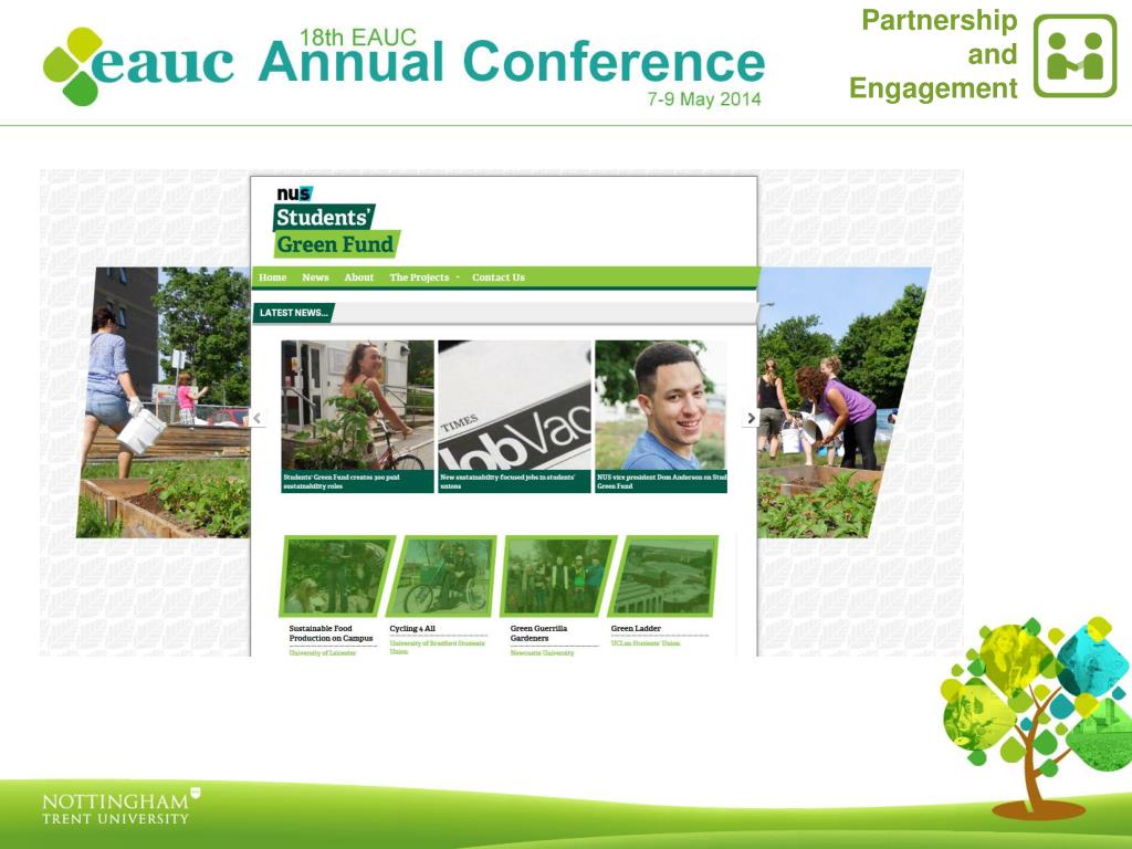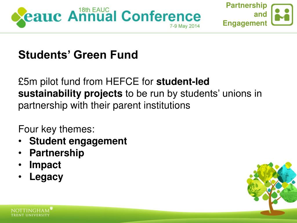 Partnership and Engagement • Students’ Green Fund • £5m pilot fund from HEFCE for student-led sustainability projects to be run by students’ unions in partnership with their parent institutions • Four key themes: • Student engagement • Partnership • Impact • Legacy
