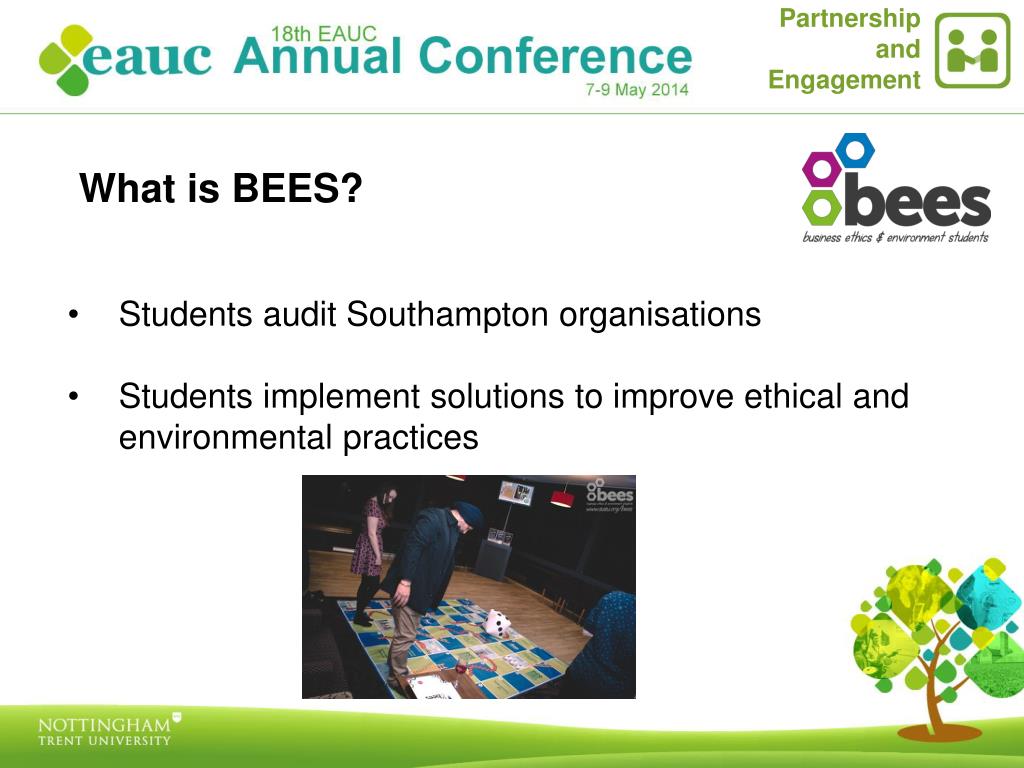 Partnership and Engagement What is BEES? • Students audit Southampton organisations • Students implement solutions to improve ethical and environmental practices