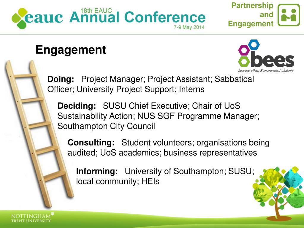 Partnership and Engagement Engagement Doing: Project Manager; Project Assistant; Sabbatical Officer; University Project Support; Interns Deciding:SUSU Chief Executive; Chair of UoS Sustainability Action; NUS SGF Programme Manager; Southampton City Council Consulting: Student volunteers; organisations being audited; UoS academics; business representatives Informing: University of Southampton; SUSU; local community; HEIs