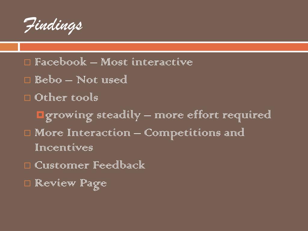Findings • Facebook – Most interactive • Bebo – Not used • Other tools • growing steadily – more effort required • More Interaction – Competitions and Incentives • Customer Feedback • Review Page