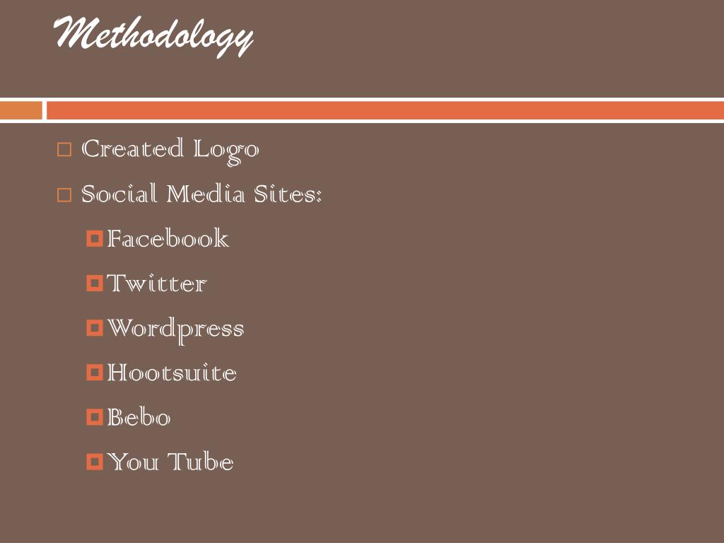 Methodology • Created Logo • Social Media Sites: • Facebook • Twitter • Wordpress • Hootsuite • Bebo • You Tube