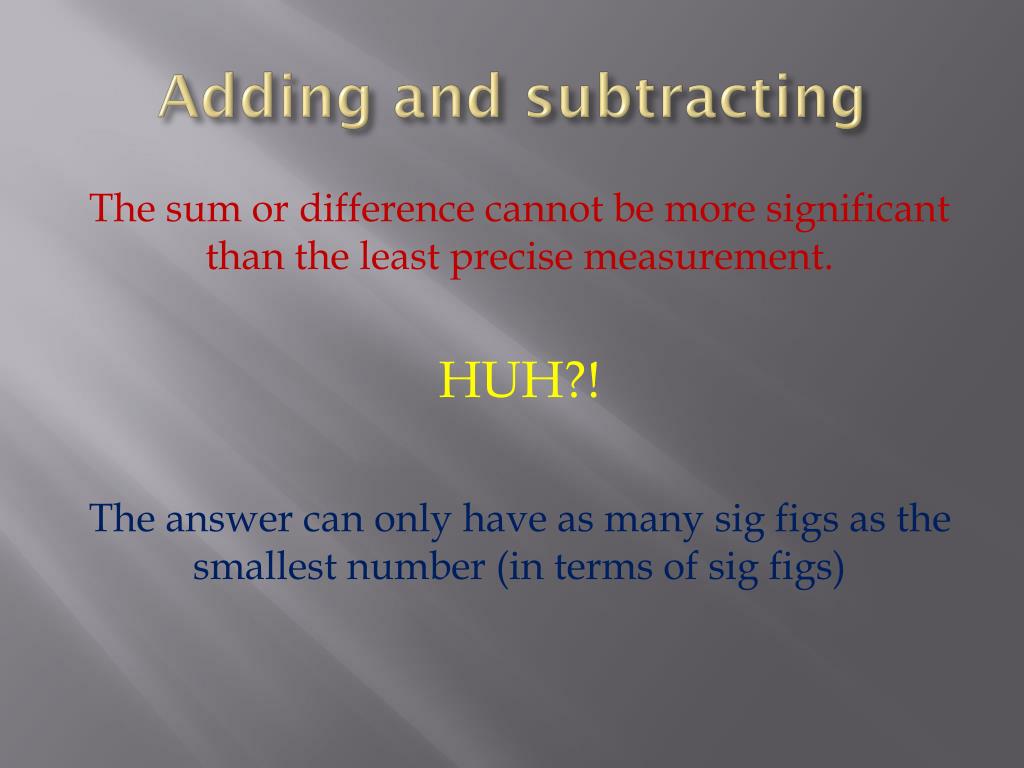 Adding and subtracting The sum or difference cannot be more significant than the least precise measurement. HUH?! The answer can only have as many sig figs as the smallest number (in terms of sig figs)