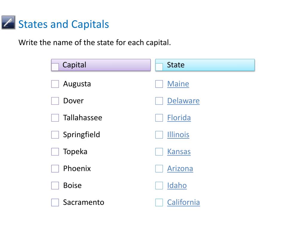 States and Capitals Write the name of the state for each capital.