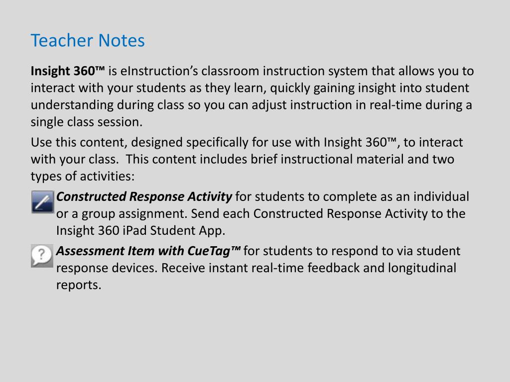Teacher Notes Insight 360™ is eInstruction’s classroom instruction system that allows you to interact with your students as they learn, quickly gaining insight into student understanding during class so you can adjust instruction in real-time during a single class session. Use this content, designed specifically for use with Insight 360™, to interact with your class. This content includes brief instructional material and two types of activities: Constructed Response Activity for students to complete as an individual or a group assignment. Send each Constructed Response Activity to the Insight 360 iPad Student App. Assessment Item with CueTag™ for students to respond to via student response devices. Receive instant real-time feedback and longitudinal reports.