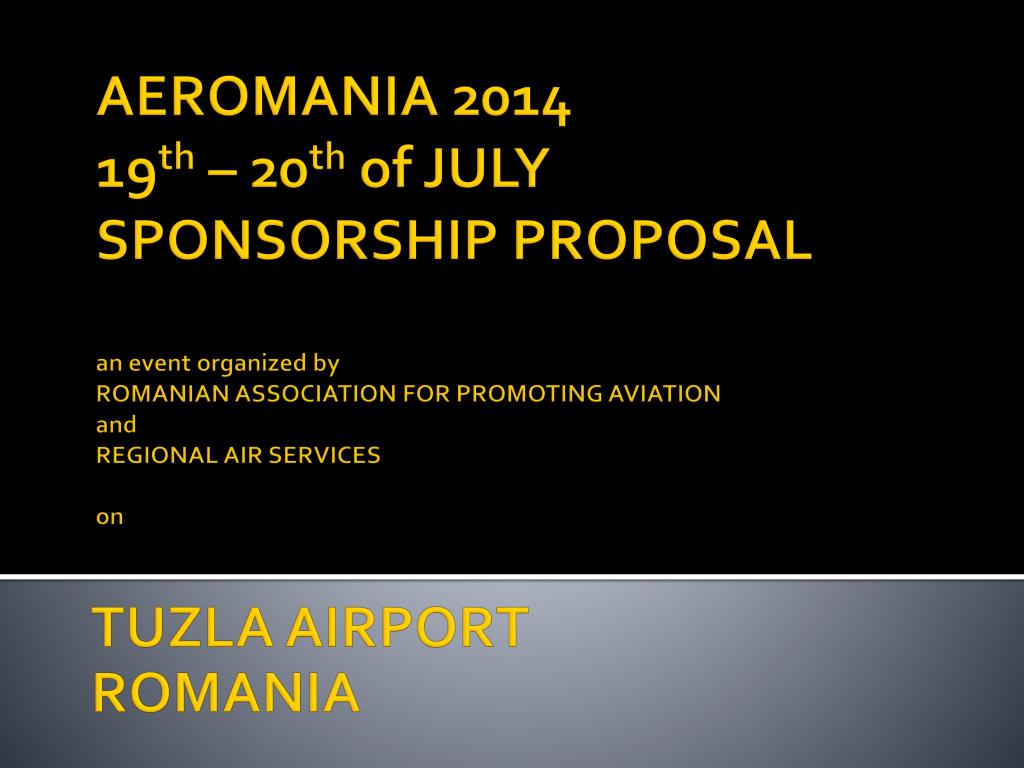 AEROMANIA 2014 19 th – 20 th of JULY SPONSORSHIP PROPOSAL an event organized by ROMANIAN ASSOCIATION FOR PROMOTING AVIATION and REGIONAL AIR SERVICES on. TUZLA AIRPORT ROMANIA. WORK IN PROGRESS: AEROMANIA, Tuzla, 19th – 20th of JULY 2014.