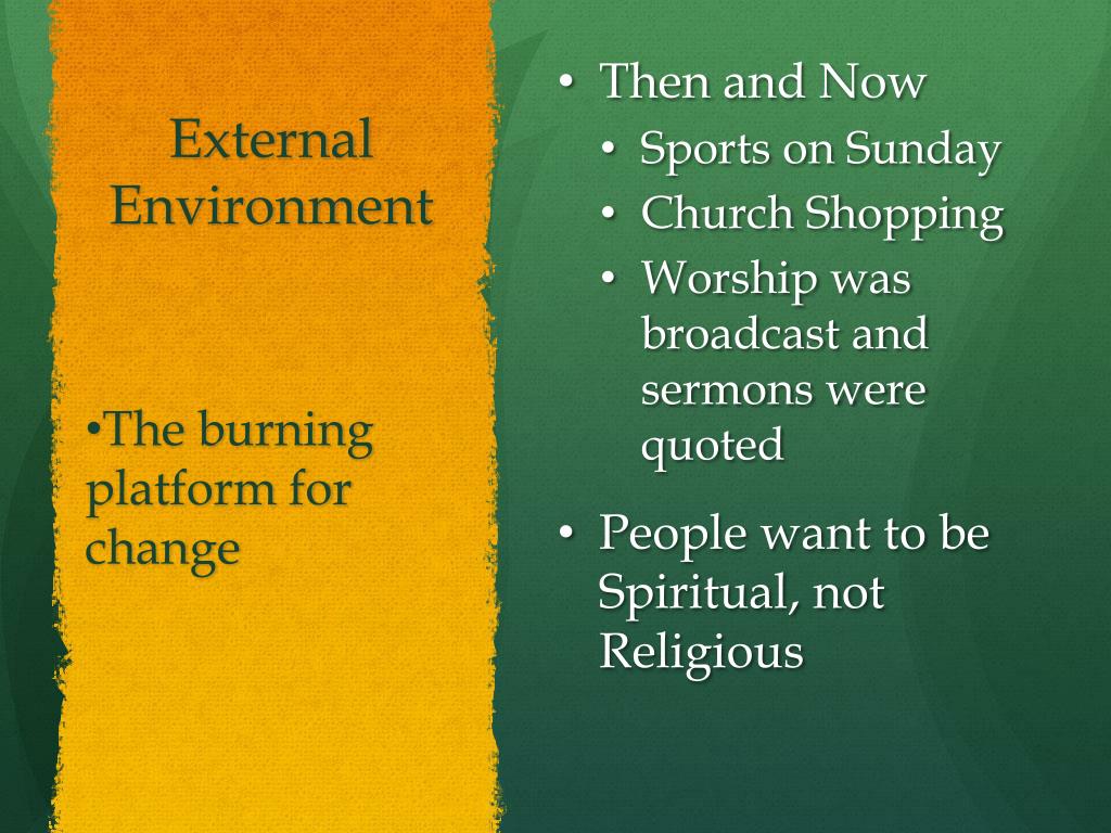 External Environment • Then and Now • Sports on Sunday • Church Shopping • Worship was broadcast and sermons were quoted • People want to be Spiritual, not Religious The burning platform for change