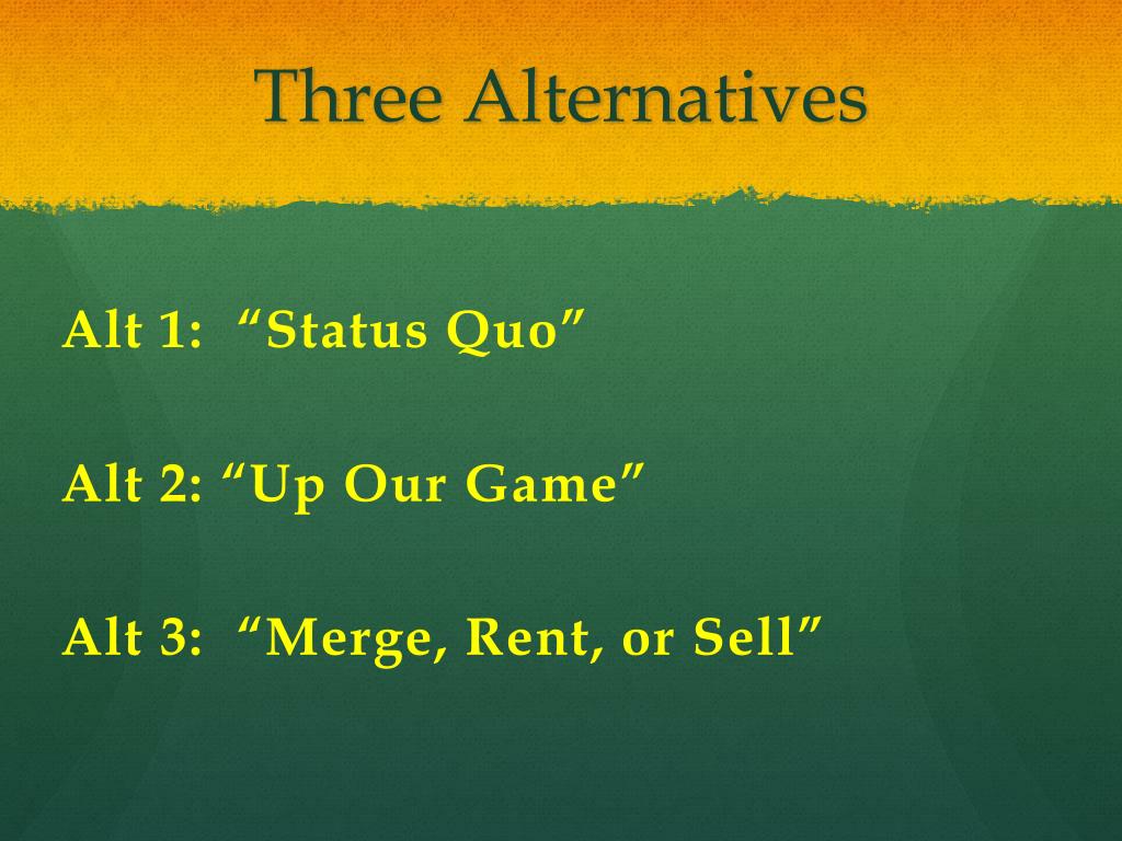 Three Alternatives Alt 1: “Status Quo” Alt 2: “Up Our Game” Alt 3: “Merge, Rent, or Sell”