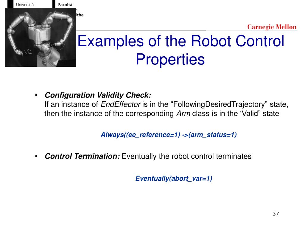 Examples of the Robot Control Properties • Configuration Validity Check:If an instance of EndEffector is in the “FollowingDesiredTrajectory” state, then the instance of the corresponding Arm class is in the ‘Valid” state • Always((ee_reference=1) ->(arm_status=1) • Control Termination: Eventually the robot control terminates • Eventually(abort_var=1)