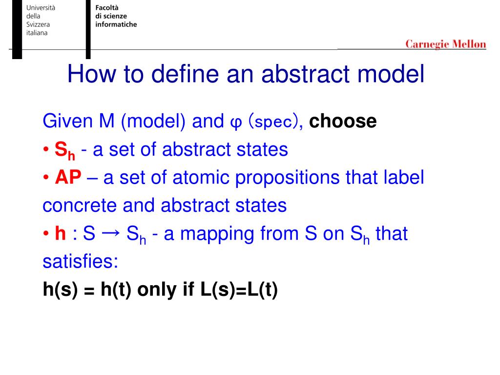 How to define an abstract model Given M (model) and ϕ (spec), choose • Sh- a set of abstract states • AP – a set of atomic propositions that label concrete and abstract states • h : S → Sh - a mapping from S on Sh that satisfies: h(s) = h(t) only if L(s)=L(t)