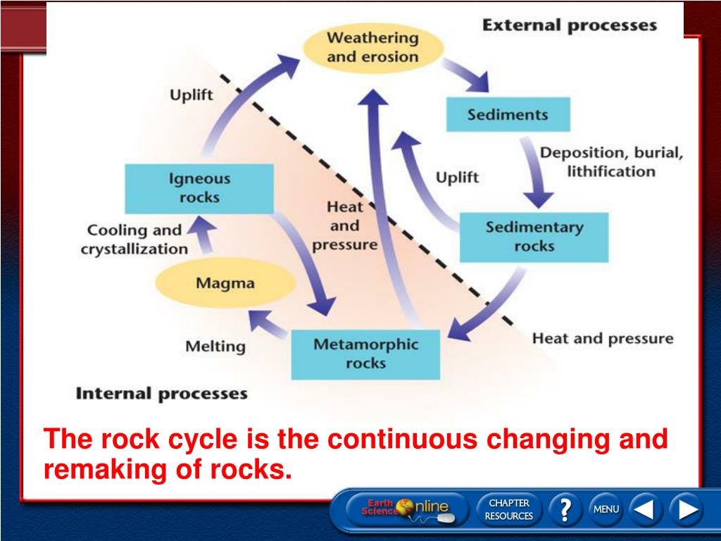 The rock cycle is the continuous changing and remaking of rocks.