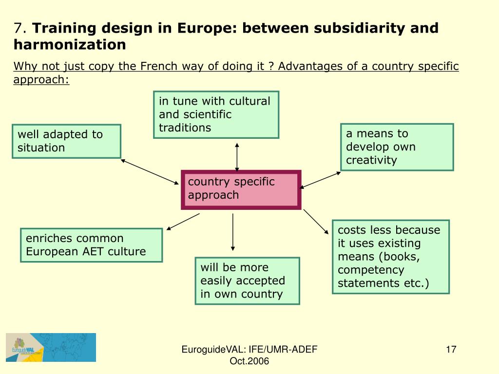 7. Training design in Europe: between subsidiarity and harmonization Why not just copy the French way of doing it ? Advantages of a country specific approach: in tune with cultural and scientific traditions a means to develop own creativity well adapted to situation country specific approach costs less because it uses existing means (books, competency statements etc.) enriches common European AET culture will be more easily accepted in own country EuroguideVAL: IFE/UMR-ADEF Oct.2006
