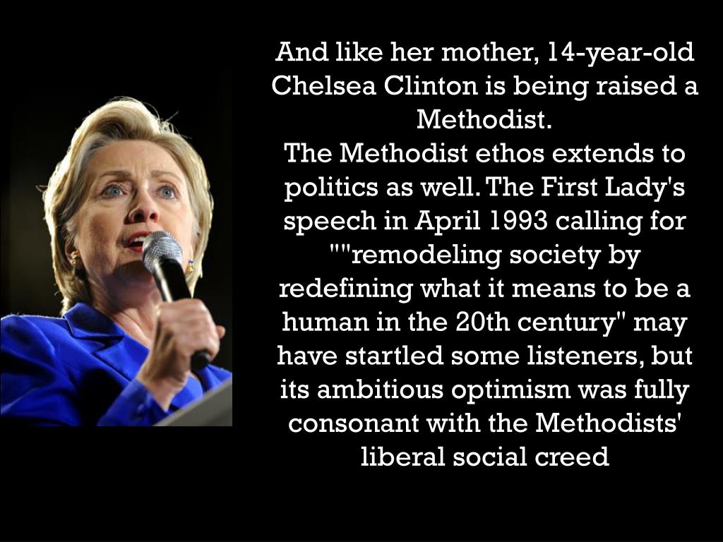 And like her mother, 14-year-old Chelsea Clinton is being raised a Methodist. The Methodist ethos extends to politics as well. The First Lady's speech in April 1993 calling for ""remodeling society by redefining what it means to be a human in the 20th century'' may have startled some listeners, but its ambitious optimism was fully consonant with the Methodists' liberal social creed